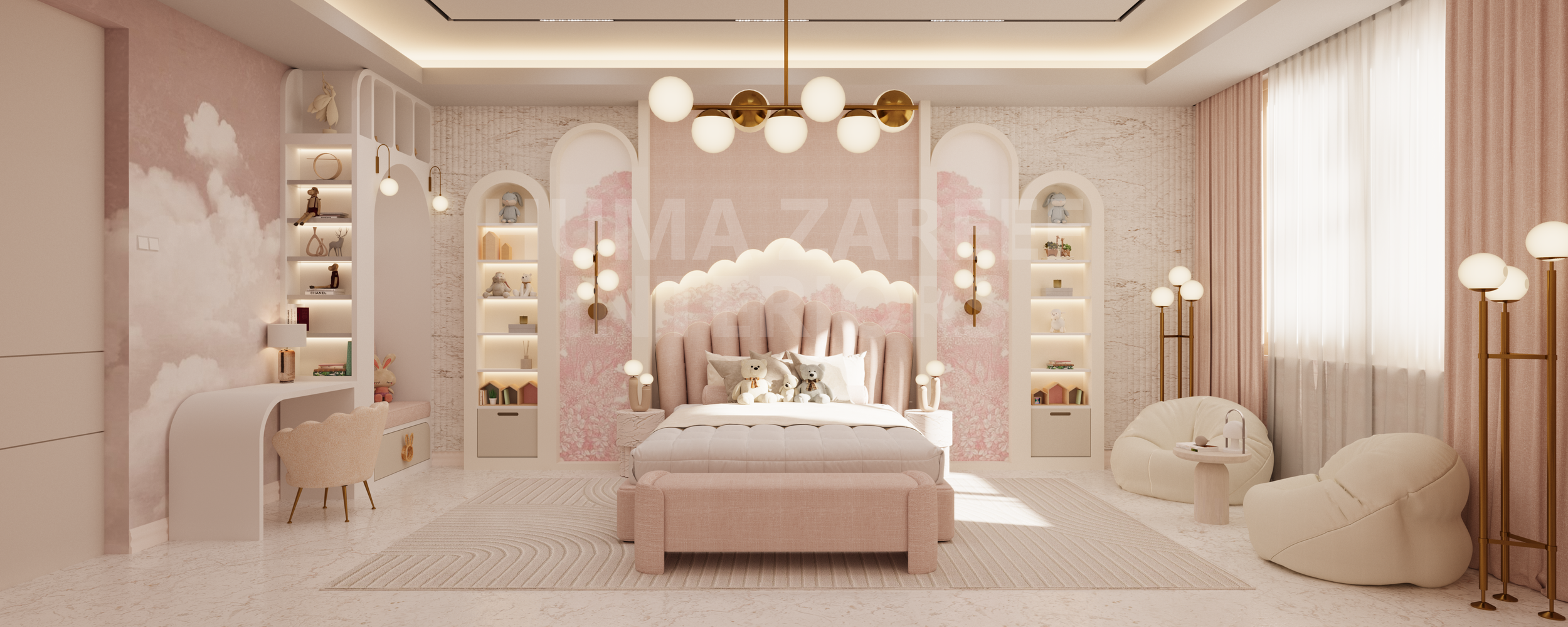 This concept was designed for a young girl who needed a bedroom that felt soft, joyful and nurturing while still being timeless as she grows. The brief focused on creating a space that balances playfulness with elegance—gentle colours, cosy textures and thoughtfully planned zones for sleep, study and quiet moments.